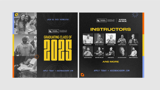 As the Creative Director for Ascend Academy, I managed all of the school's social media platforms, created all graphic and video content, and maintained the school's webpage for over 4 years. During my time with Ascend Academy, part of the creative strategy I developed for the school was to set up a new visual branding guide/theme each semester. Below is a collection of graphics (social content, digital ads, presentation slides, etc.) I designed for the 2023 Winter Semester campaign.